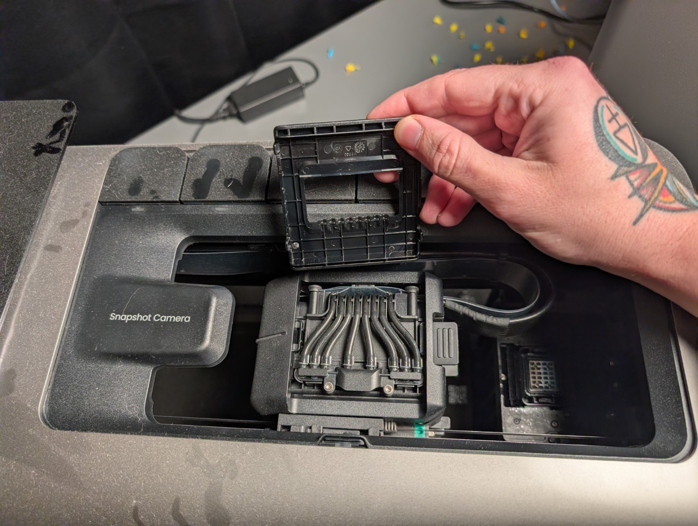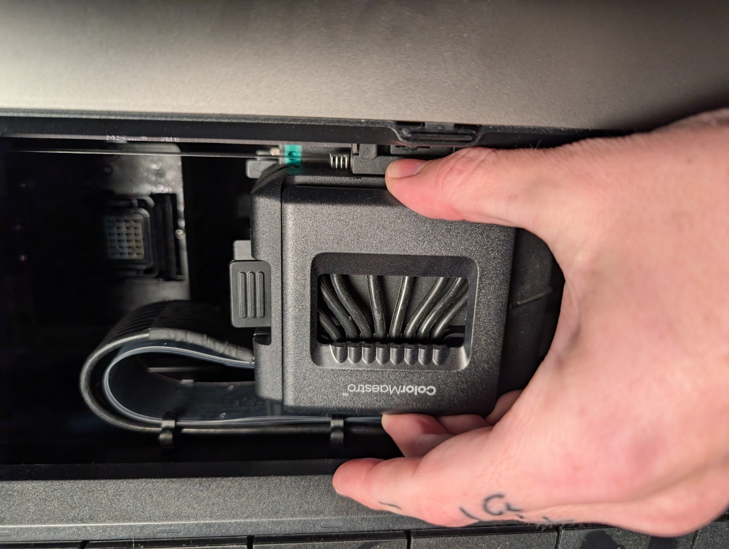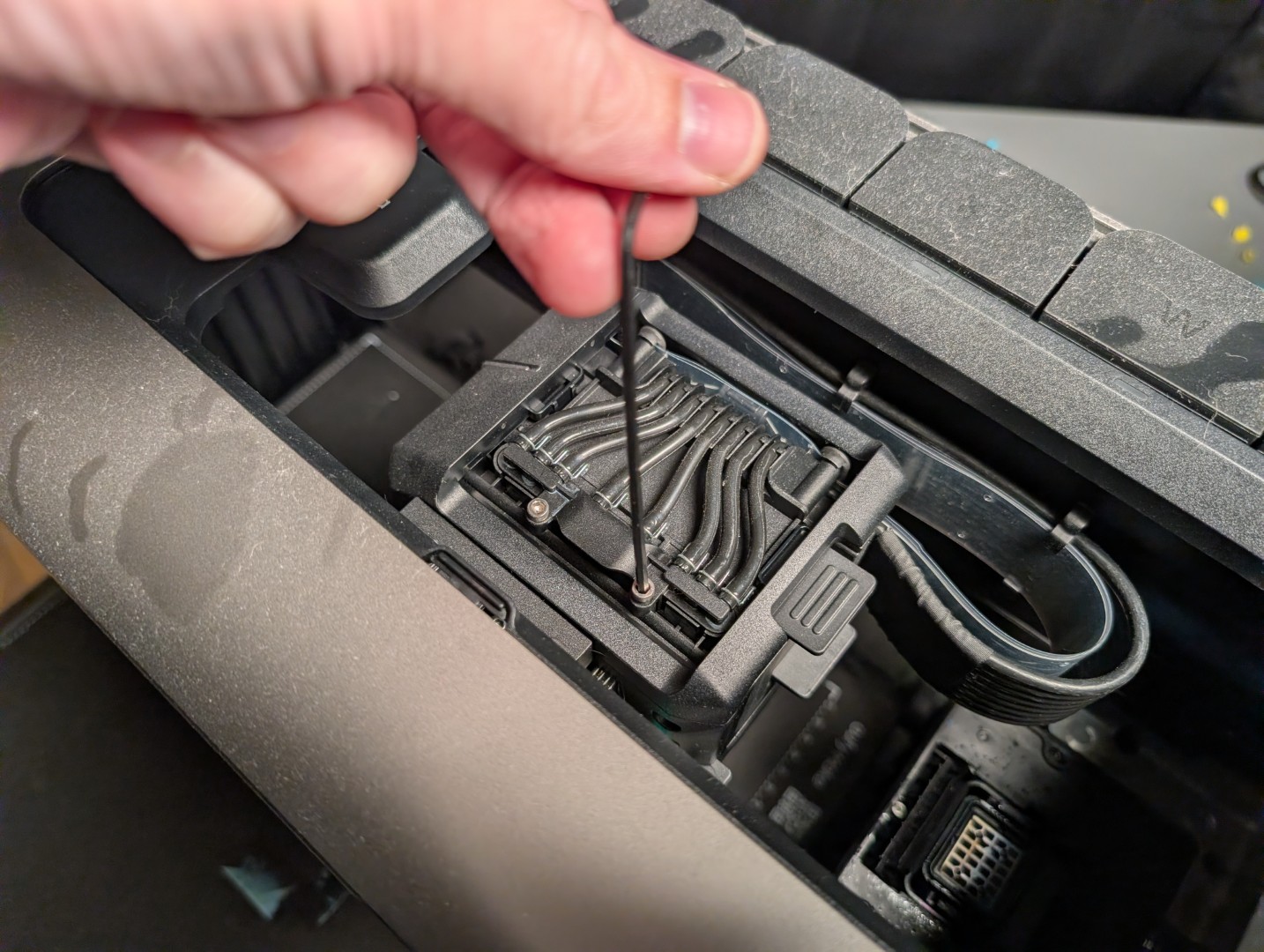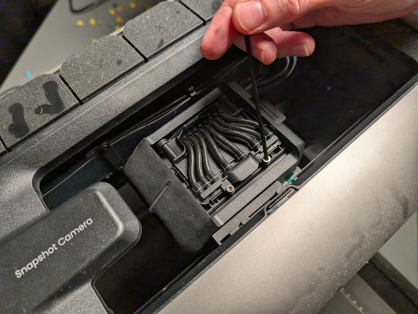 Slide the new printhead in, push the ink tube “rack” back down into place, screw the screws back in, and snap on the “Color Maestro” cover.