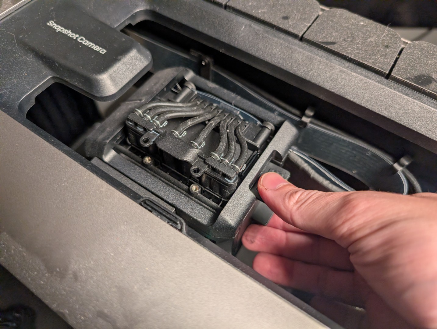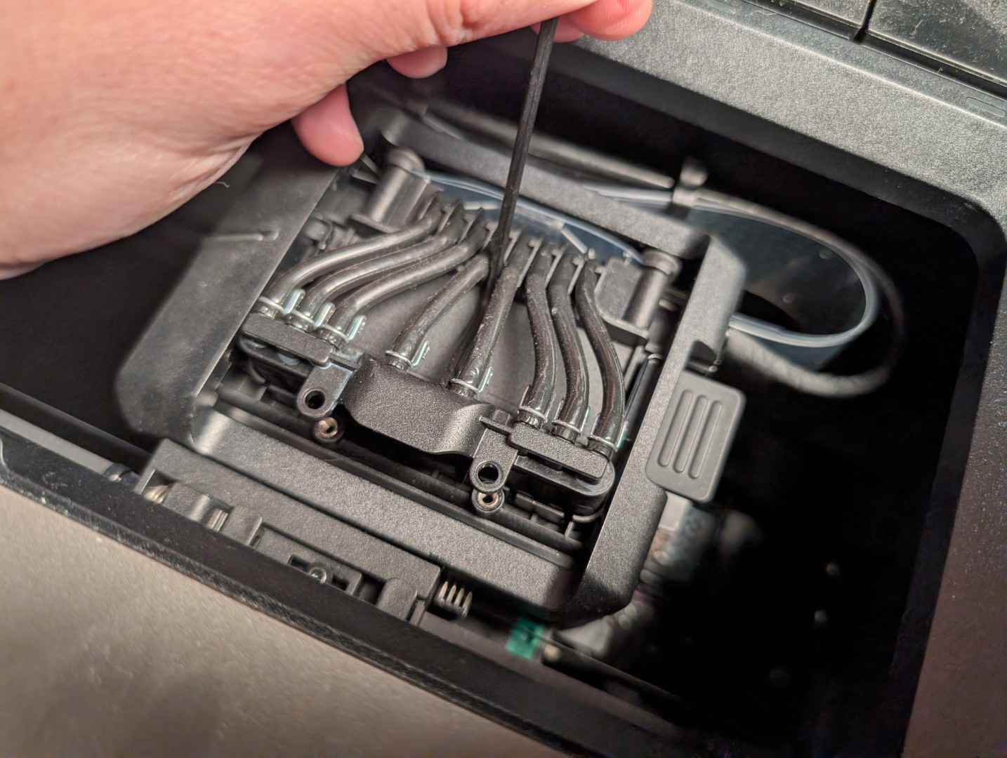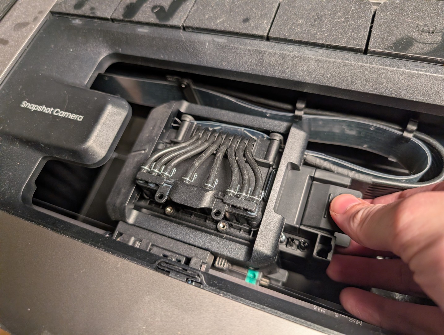 There is a kind of “rack” piece where all of the ink tubes go into the printhead, kind of like a manifold. You don’t need to remove the individual tubes, because the entire “rack” lifts up and pulls them all out together.